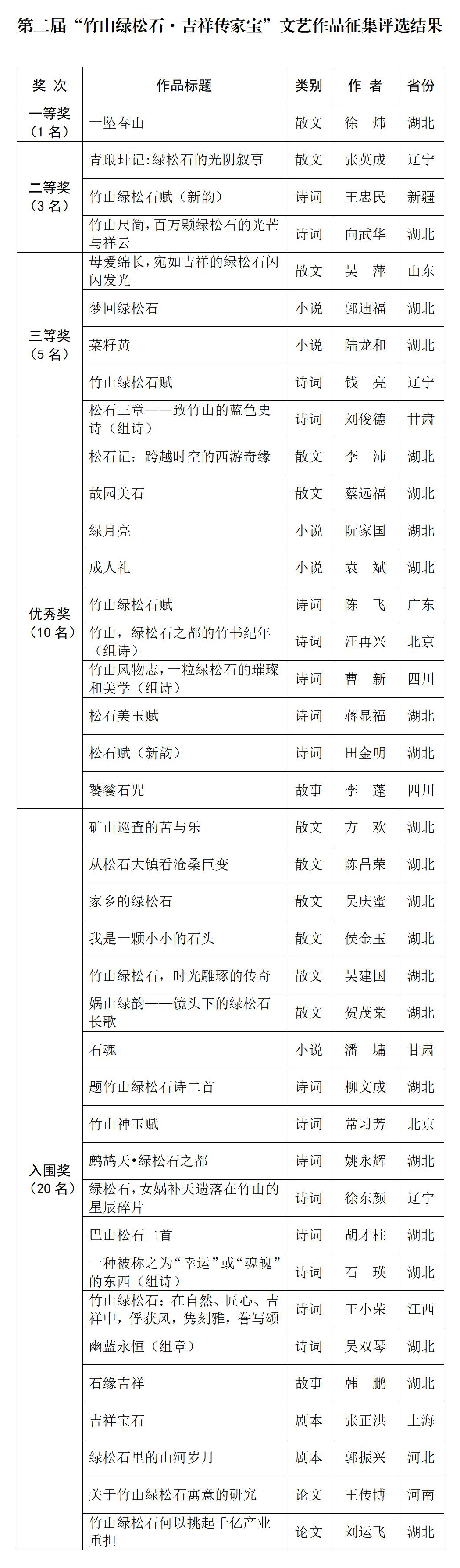 为了传播竹山绿松石文化,进一步提升竹山绿松石品牌形象,扩大竹山绿松石知名度和美誉度,竹山县于2025年4月8日公开发布了第二届“竹山绿松石·吉祥传家宝”文艺作品征集启事。活动得到全国广大作者的大力支持和踊跃参与,至8月10日24点截稿,共收到各类作品500多篇(首)。经初评、复评、终评,共评选出拟获奖作品39篇(首),现予公示。
